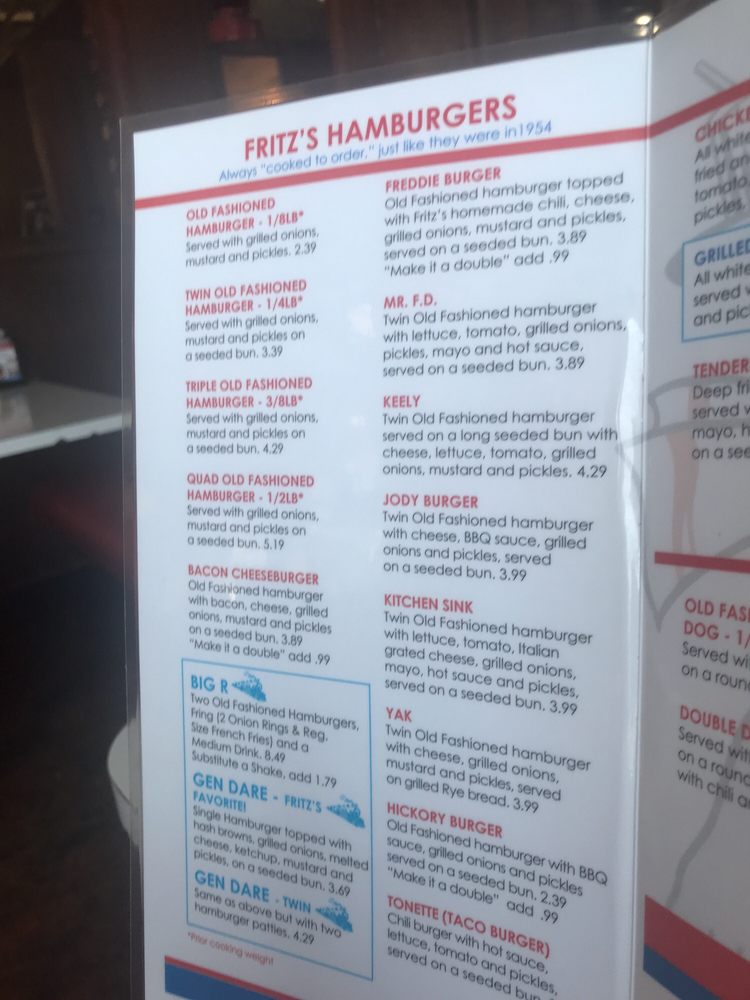 Old fashioned hamburger topped with Fritz's homemade chili, cheese, grilled onions, mustard and pickles, served on a seeded bun. "Make it a double for an additional charge.